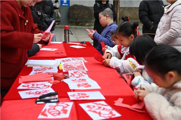 “福满童心 共话团圆”剪纸活动中,孩子们在老师指导下,剪出“福运绵长”等窗花作品,指尖流转间,感受着传统工艺与文字记载里的双重祈福智慧;“新春吉语”拓福摊位前,家长与孩子携手拓印“马上有福”“岁岁平安”等吉祥模板,定格专属新春福气。