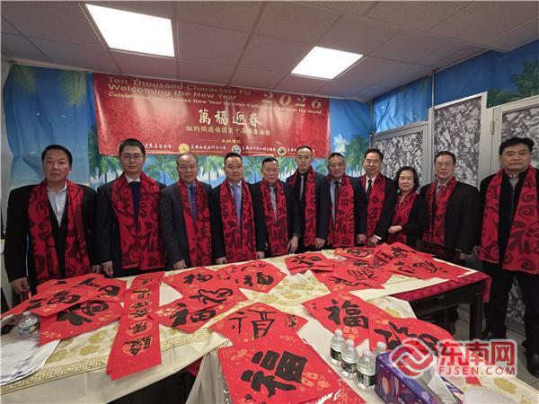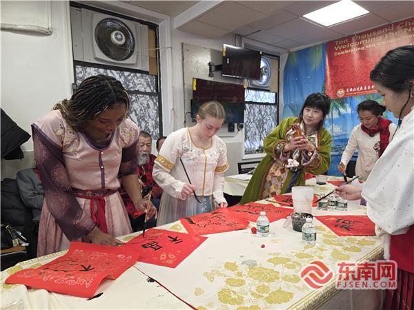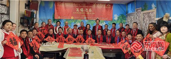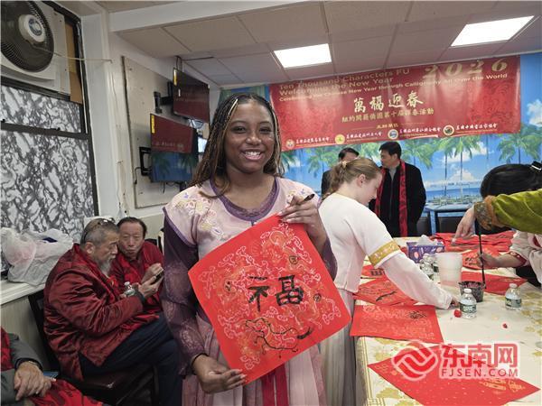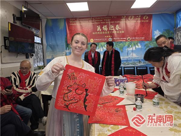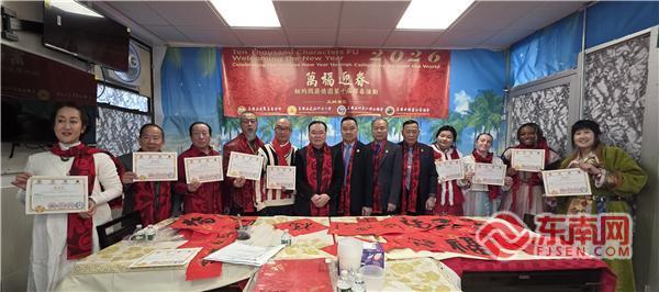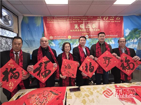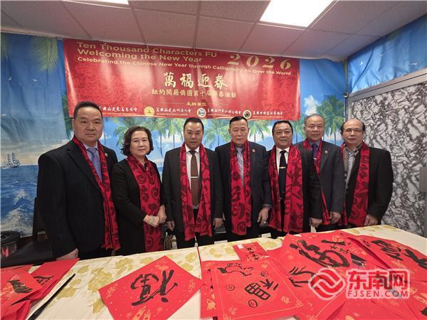 东南网2月2日讯(特约记者 纽约墨人)当地时间2月1日,为弘扬书法艺术,促进国际文化交流,由美国福建慈善基金会、美国福建福州老人会、美国福州亭江联合总会、美国中国书法家协会联合主办的2026年“万福迎春·共庆新年”纽约闽籍侨团第十届挥春活动(以下简称“挥春活动”)在纽约唐人街举行,现场为社区民众免费书写春联。中国驻纽约总领馆领事向裕韬、荣顶,美国福建慈善基金会主席林德明,美国福建福州老人会主席郑敬桂,美国福州亭江联合总会主席林新,美国中国书法家协会主席李兆银以及美国中国书法家协会的多位书法家张军、叶济民、郑子团、武福生、刘剑尘、武昌愚、李静雨、杨行和爱好中国书法的国际友人艾瑞尔·罗伯茨、露西·米勒、马美琪一同参加挥春活动。