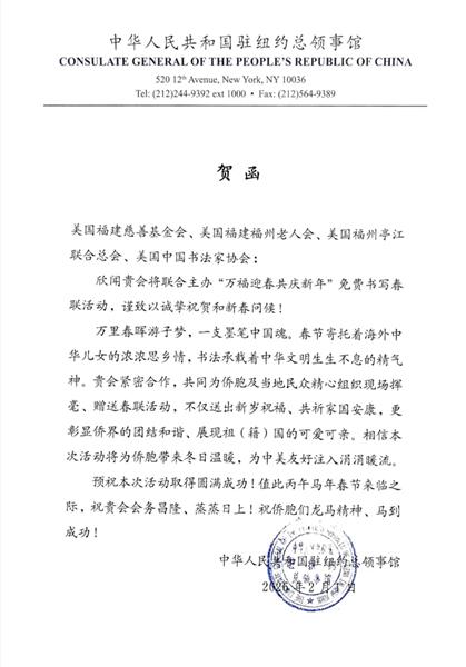 向裕韬在致辞时宣读了中国驻纽约总领馆的挥春活动贺函。他表示,春节寄托着海外中华儿女的浓浓思乡情,书法承载着中华文明生生不息的精气神。现场挥毫,赠送春联,不仅送出新春祝福,共祈家国安康,更彰显侨界的团结和谐,展现祖(籍)国的可爱可亲。相信挥春活动将为侨胞带来冬日温暖,为中美友好注入涓涓暖流。值此丙午马年春节来临之际,祝主办社团会务昌隆,蒸蒸日上。祝侨胞们龙马精神,马到成功。