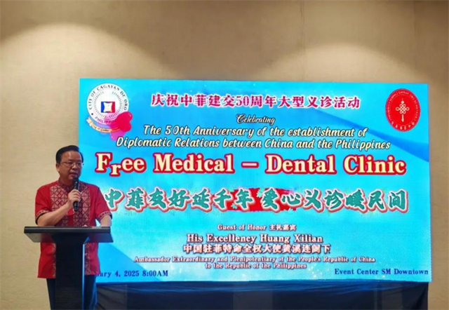 2月4日,中国驻菲律宾大使黄溪连和夫人曹轶群赴卡加延德奥罗市(鄢市)慰问侨胞,拜会鄢市市长罗兰多·黄,并应邀作为主宾出席鄢市首届“中菲友好延千年,爱心义诊暖民间”春节义诊活动。