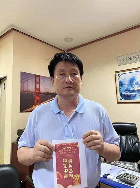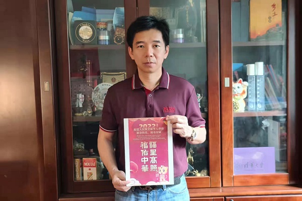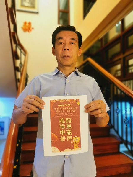 菲律宾旅菲校友联合会四位共同主席手持“福星高照 福佑中华”的福建“福”文化标识向向家乡人民拜年!