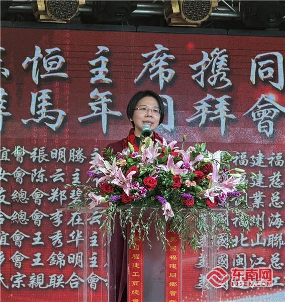 孙丽萍在致辞中表示,过去的一年,美国福建同乡会在主席陈恒的领导下,在各乡亲会的支持下,团结向上、积极进取,大家密切联系乡亲,热心服务侨胞,弘扬中华优秀传统文化,助力祖(籍)国的发展建设,促进中美人民友好往来,为旅美福建乡亲的福祉以及侨社的和谐繁荣,做出了积极贡献。希望今后继续发扬光荣传统,团结带领福建乡亲为中华民族复兴伟业,为中美人民友好贡献新的力量,每一位福建乡亲也一定能够在这个过程当中书写自己更加精彩的人生。值此马年春节即将到来之际,祝愿美国福建同乡会会务昌隆、蒸蒸日上。祝愿大家马年吉祥、龙马精神,一马当先、马到成功。