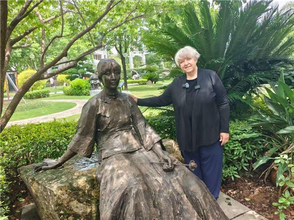 在三山人文纪念园,穆言灵特意在冰心的雕像前留影发给冰心的孙女。