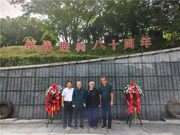 陈世明(左二)和穆言灵(左三)在福州抗日志士纪念墙前留影。