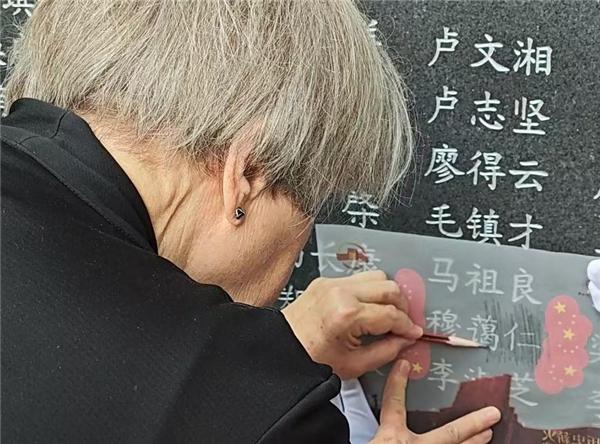 穆言灵在福州抗日志士纪念墙上用铅笔翻拓穆蔼仁的名字。