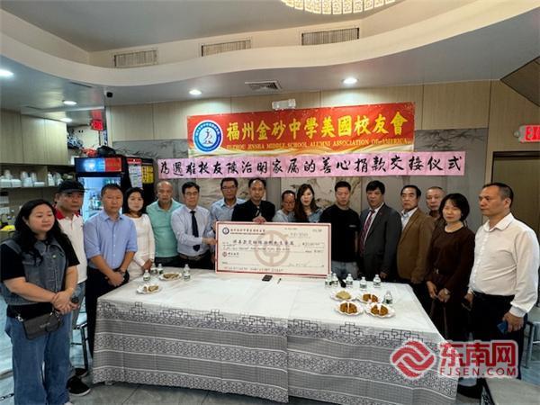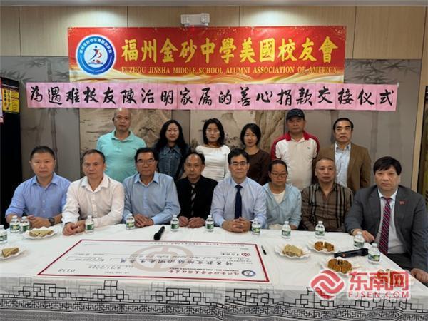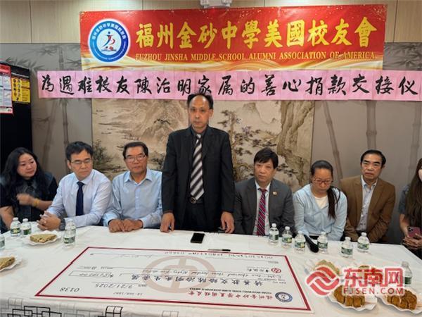 东南网9月23日讯(特约记者 纽约墨人)当地时间9月21日,福州金砂中学美国校友会(以下简称“校友会”)在布碌仑举行为遇难校友陈治明家属善心捐款8万多美元的交接仪式(以下简称“交接仪式”)。