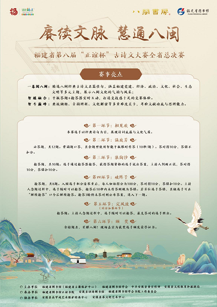 为贯彻落实党的二十届三中全会精神,深入学习贯彻习近平文化思想及习近平总书记在福建考察时的重要讲话精神,紧紧围绕“在提升文化影响力、展示福建新形象上久久为功”的重要要求,推动八闽优秀传统文化融入现代生活,推进优质文化资源直达基层,助力打响“八闽书房”阅读品牌“一卷阅八闽”,自2025年4月起,福建省图书馆(福建省古籍保护中心)、福建省图书馆学会在全省范围内开展“赓续文脉 慧通八闽——福建省第八届‘正谊杯’古诗文大赛”活动。